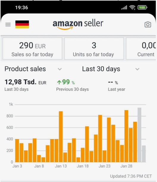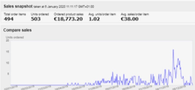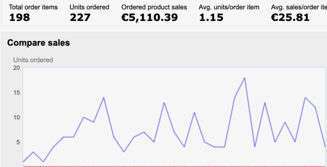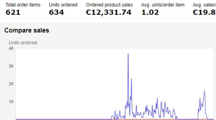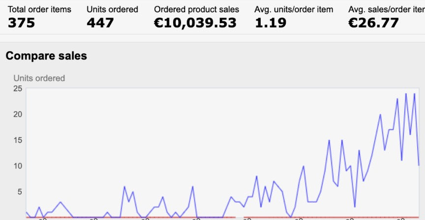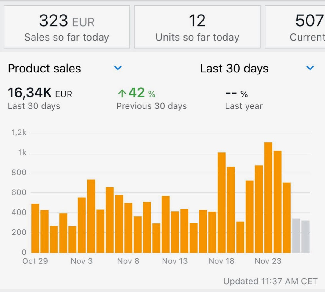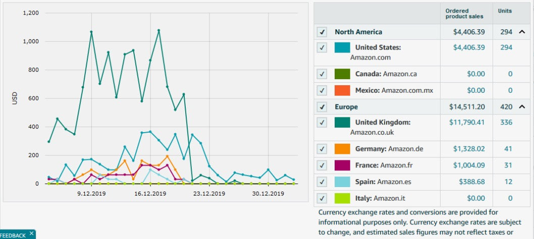 227 sztuk sprzedanych i około 5000 € obrotu. Zdaję sobie sprawę, że jest to zasługa świątecznego szału zakupowego, ale bywały dni, w których klienci kupowali po 3–4 sztuki, więc wygląda na to, że produkt się podoba i po pierwszym miesiącu jesteśmy praktycznie wyprzedani. Kilka razy podnieśliśmy cenę z nadzieją, że spowolnimy sprzedaż, ponieważ brakuje nam towaru. Reklamy także wyłączone, ale produkt nadal się sprzedaje. Również na innych rynkach wpadają pojedyncze sztuki.